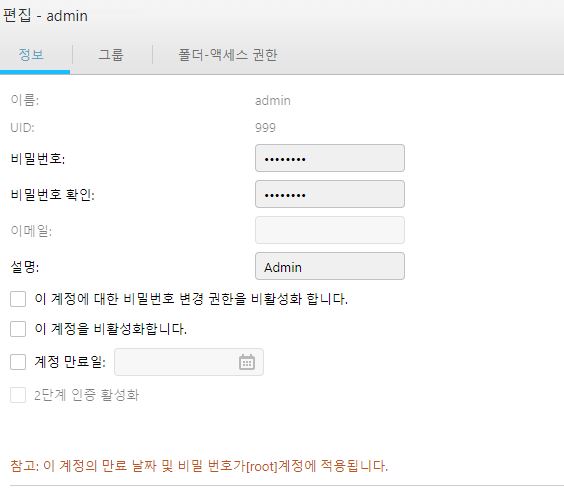 이 계정은 NAS의 모든 권한을 가지고 있는 계정이므로, 필요하지 않은 경우라면 보통 비활성화해두시는게 좋습니다.