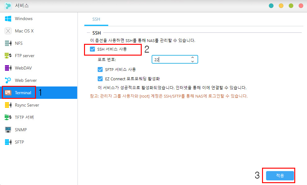 터미널 클릭 -> SSH사용 체크(활성화) -> 적용 클릭.
