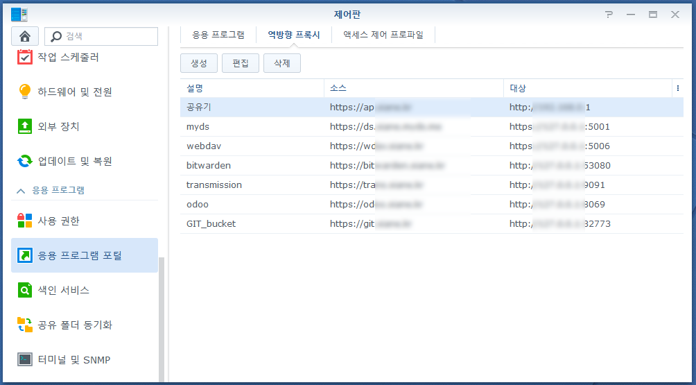 역방향 프록시 설정은 시놀로지의 경우 너무 간단하게 되어있어 누구나 쉽게 사용이 가능합니다. ASUSTOR 에서 넘어오게 된 결정적인 이유였는데, 기변 하자마자 ASUSTOR에서 업데이트를 했네요 ㅎㅎ