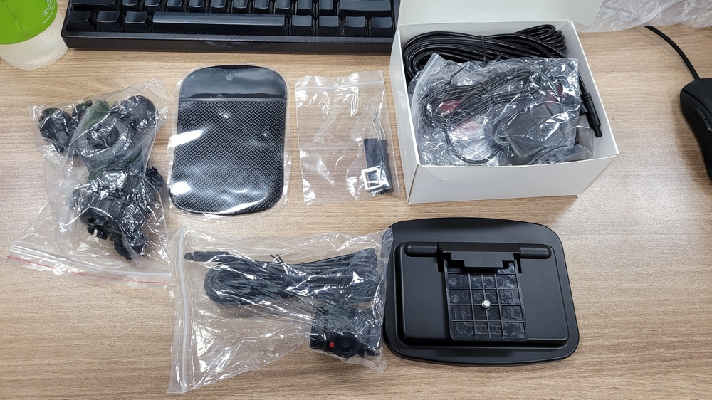 좌상단부터 용도를 알 수 없는 무언가. 논슬립패드, 심가이드와 나사, 드라이버, 사이드캠과 후방캠, 전방캠, 대시보드 거치용 가이드입니다.