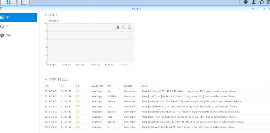 기본설정을 하셨다면 admin, guest 계정은 막혀있으니 큰 문제가 없다고 볼 수 도 있는데, 나스이름과 관리자계정을 동일하게 쓰는 경우도 시도할 수 있고, IP차단 방식은 당장은 효과가 있지만 언젠가는 뜷릴 수 밖에 없는 방법입니다.