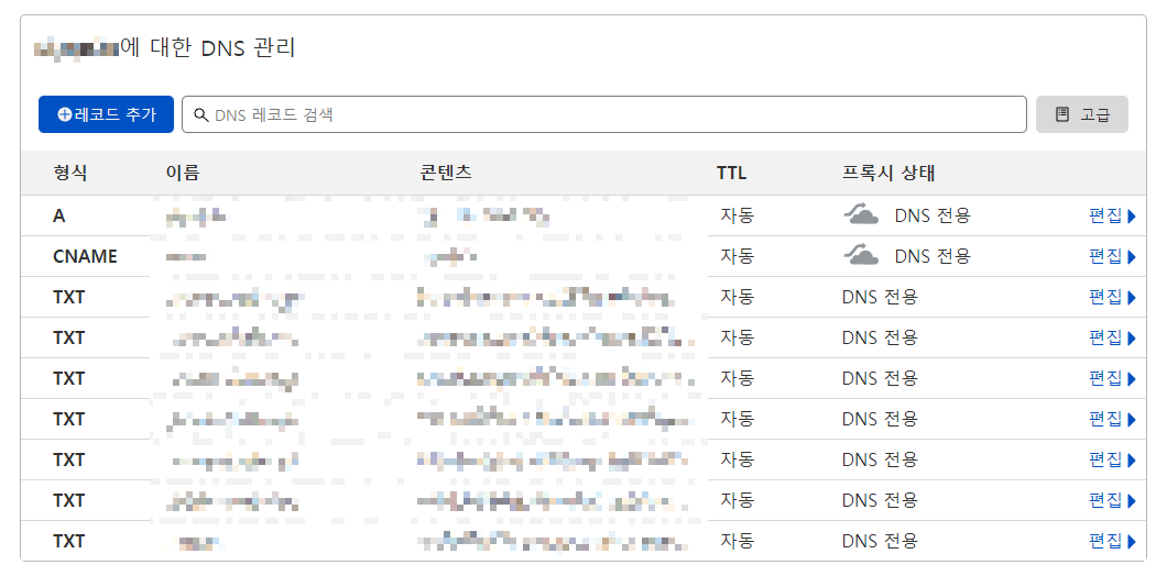 이렇게 DNS 관리 부분이 나옵니다. 프록시 상태 부분을 DNS전용으로 설정하는것이 속도면에서 유리합니다.
