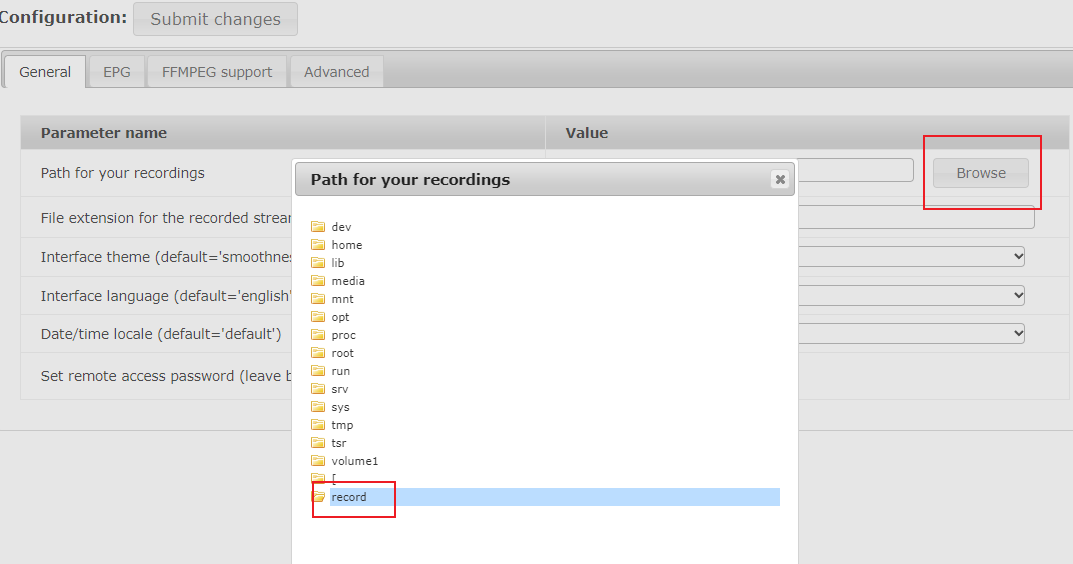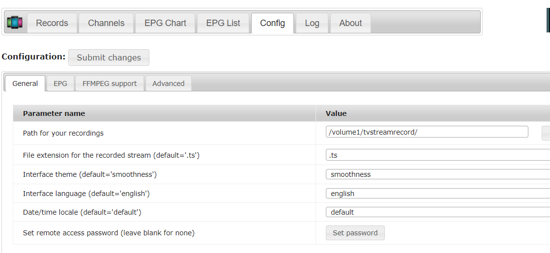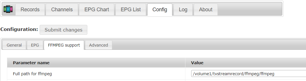 IP:8030 으로 tvstreamrecord페이지를 열고, Config - FFMPEG support 탭으로 갑니다.