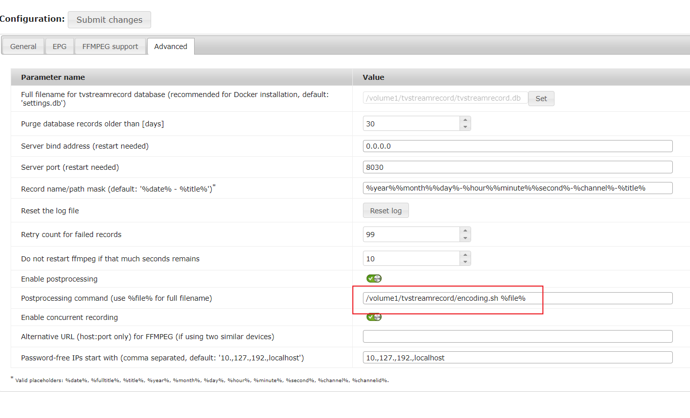 Postprocessing command (use %file% for full filename) - /volume1/tvstreamrecord/encoding.sh "%file%"
