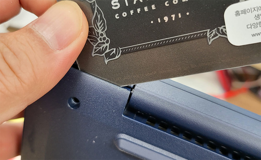 나사를 모두 해제했다면, 안쓰는 카드로 쓱 찔러넣어 벌려줍니다. 양쪽을 툭툭 벌린 후 손으로 뜯으면 되는데, 이 사진의 반대쪽은 카드로 쓱 긁어주면 쉽게 분리할 수 있습니다.