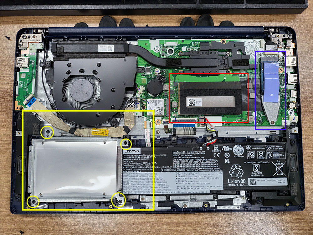2.5인치 디스크(HDD/SSD) 장착을 위해서는 노란쪽, 램 추가를 위해서는 빨간 사각형, m.2 nvme 교체를 위해서는 우측의 청색 사각형 위치를 보시면 됩니다.