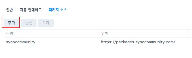 패키지 센터 - 설정 - 패키지 소스 - 추가 버튼 클릭 -