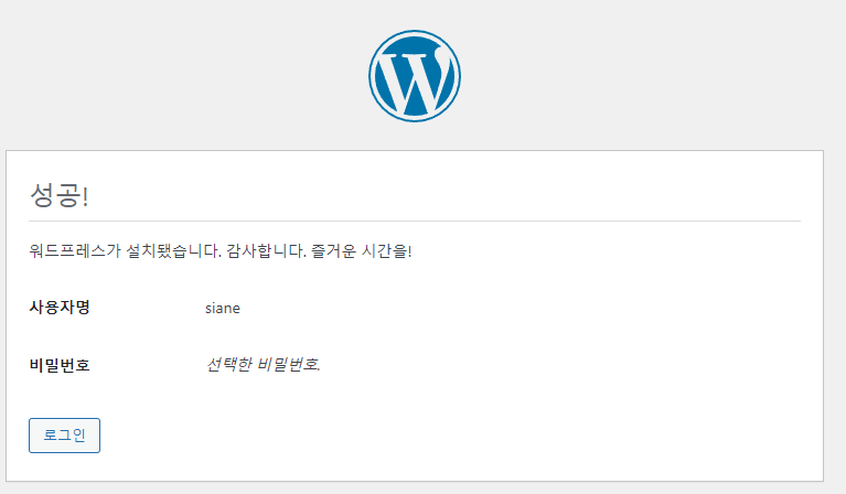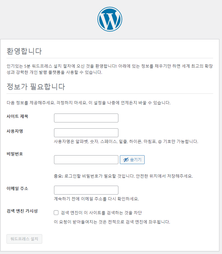 모든 값을 입력했다면, 하단의 워드프레스 설치 버튼을 눌러줍니다.