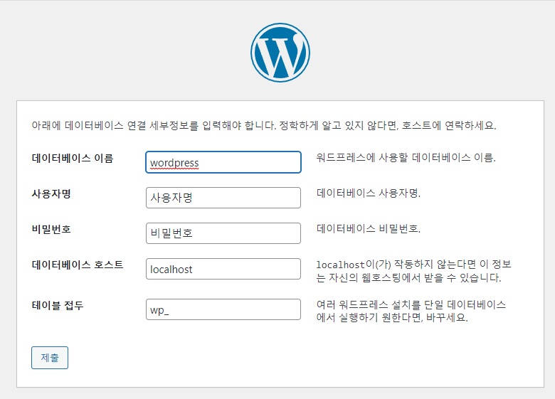시키는대로 입력합니다. 데이터베이스는 위에서 만든 데이터베이스명을, 사용자명과 비밀번호는 데이터베이스의 사용자명/비밀번호를, 호스트는 그냥 두시고, 테이블 접두 부분의 경우, 동일한 DB에서 여러개의 사이트를 운영한다면, 알아보기 편하게 변경합니다. 이 글에서는 기본값으로 진행합니다.