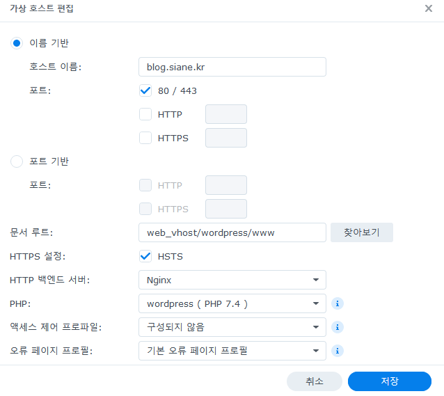 Host Name : 접속할 주소(이 글에서는 blog.siane.kr를 사용합니다.)