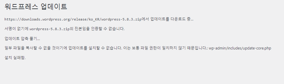 업데이트 시 이런 문구를 보게 됩니다. 위 경로 wp-admin/includes/update-core.php 부분의 권한이 없기 때문입니다.