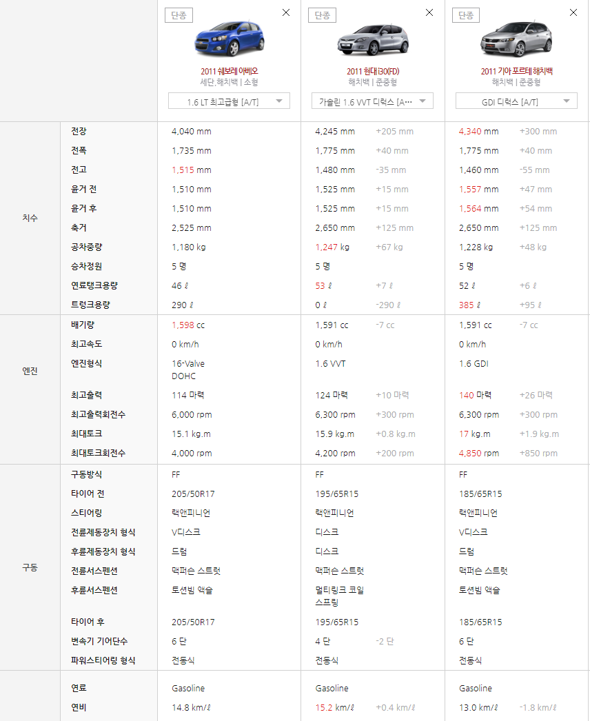 공인연비는 아베오가 14.8, i30 15.2, 포르테 해치백이 13입니다.