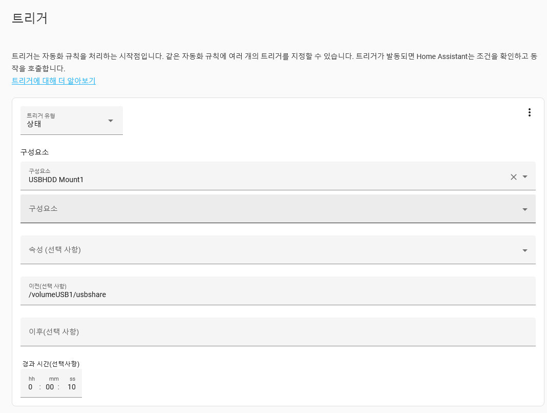 USBHDD Mount1의 값이 /volumeUSB1/usbshare 에서 다른 값으로 변경되는 경우, 10초후에 스마트플러그를 끄는 트리거입니다.