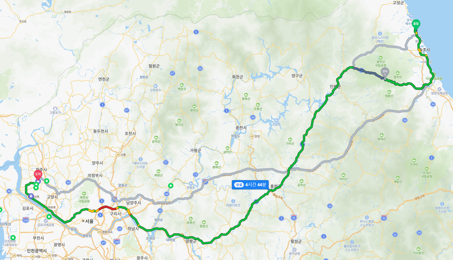 출발시간은 05:00이며, 자유로 - 강변북로 - 경춘로 등을 통과해 미시령 옛길을 지나 아야진해변까지의 경로였습니다.