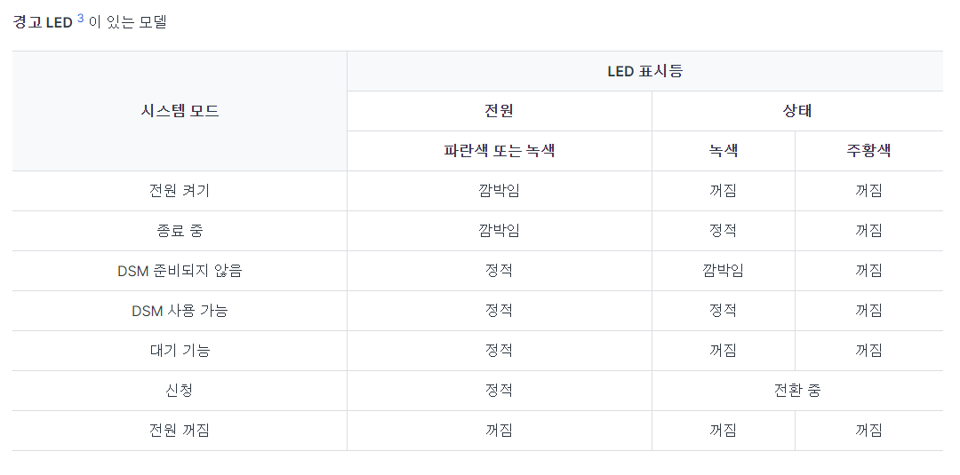 https://kb.synology.com/ko-kr/DSM/tutorial/Overview_of_LED_indicator_statuses_during_bootup