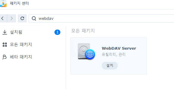 패키지 센터 -> 모든 패키지-> 상단에 webdav 입력 후 엔터를 입력해 webdav server 패키지를 찾아 설치합니다.