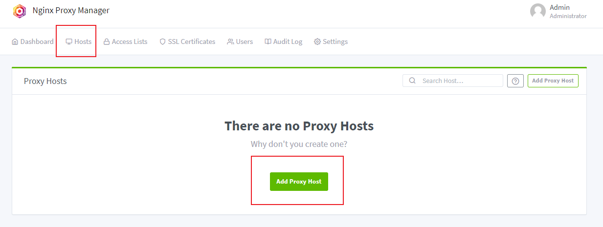 Hosts > Proxy Hosts > Add Proxy Host 클릭