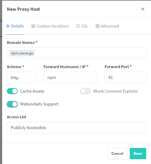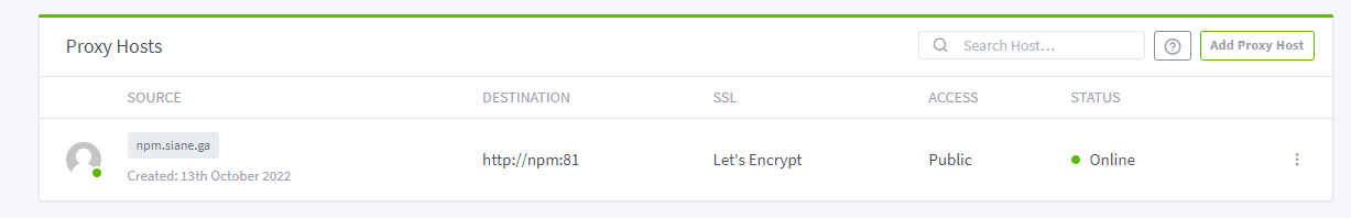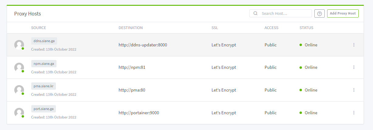 service로 묶인 친구들은 서로 통신이 가능하므로, 포트를 열어주지 않아도 서로 통신이 가능해요. 즉, 이 작업 이후에 81포트가 외부와 통신이 되지 않아도 된다는것이며, nginx-proxy-manager의 설정페이지는 npm.siane.ga를 통해서만 접근이 가능해집니다.