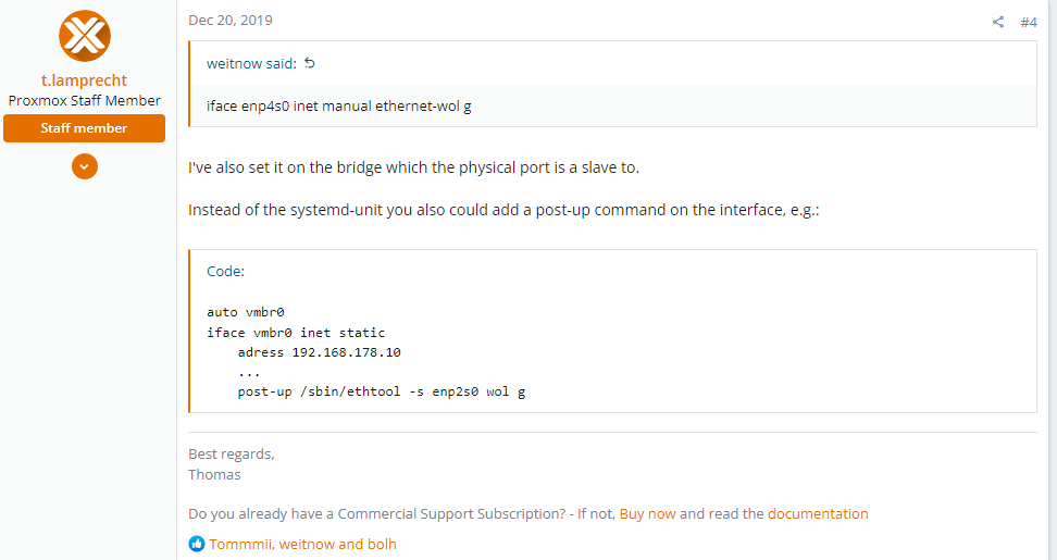 wakeonlan unter Proxmox Unbedingt das Bios anpassen! Leider ist das bei jedem Mainboard anders und ich kann hier nichts notieren (als Vorgabe). Zunächst wird das ethtool benötigt: | ethtool Debian apt update && apt upgrade -y apt install ethtool Erforder