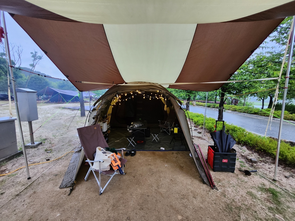 도착했을 때 비가 부슬부슬 오고 있어서, 일단 타프부터 펼치고 텐트를 피칭했습니다. 타프 펼치는건 금방이었는데 텐트가 타프보다 크다보니 좀 어려움이 있었네요 ..ㄷㄷ 자립이 되는 돔텐트면 편했을텐데, 터널형 텐트라 팩다운을 하고 시작해야 하는 터라 위치잡기도 아직 좀..ㅠㅠ