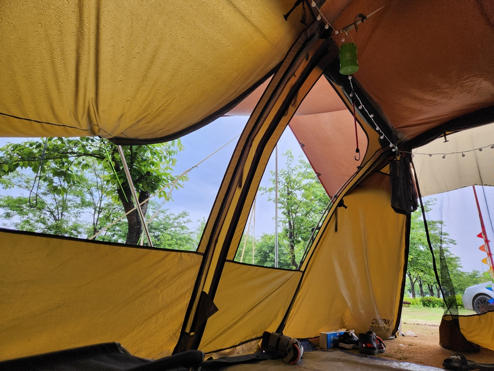 다행히 비는 계속 오지만 바람은 불지 않아서 비가 들이치거나 하진 않았습니다. 이전 이용자들이 배수로를 만들어 둔 덕에 배수로 정비도 큰 필요 없었구요. 타프에서 떨어지는 물로 앞에 물웅덩이가 생겨서 나중엔 가운데에 폴을 하나 넣어서 쭉 올려줬어요.