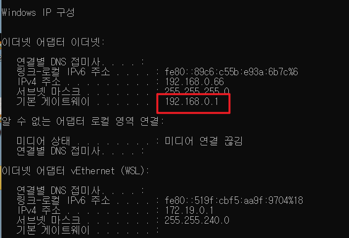 IP대역을 모르는 경우, 윈도우키+R을 입력해 실행창을 열고, cmd를 입력해 커멘드 창을 열어준 후, ipconfig를 입력합니다.