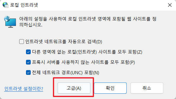 보안 탭 > 로컬 인트라넷 > 사이트 클릭