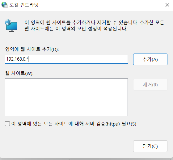 나오는 창에서 '영역에 웹 사이트 추가' 부분에 내부 IP대역을 허용처리 해 줍니다.